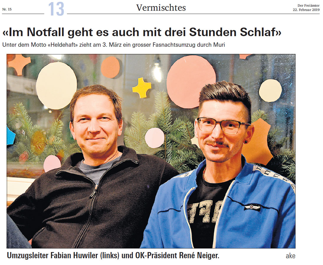 Endlich ist es wieder soweit. Murianer Fasnacht mit einem sicherlich hochstehenden Umzug durch Muri-City. Das OK steht, die Vorarbeiten laufen auf Hochtouren und "Schmetterling" haben wir auch - ohne Gefahr Bussgelder bezahlen zu müssen. Das OK wurde aus Mitgliedern der Murianer Fasnachtsgesellschaften Adelburg, Neuenburg, Wien und Hohenwien und einem Vertreter der Schulen gebildet.